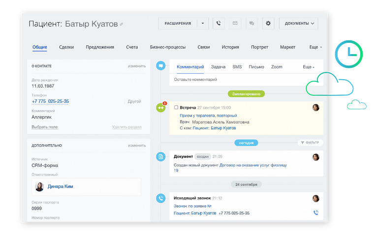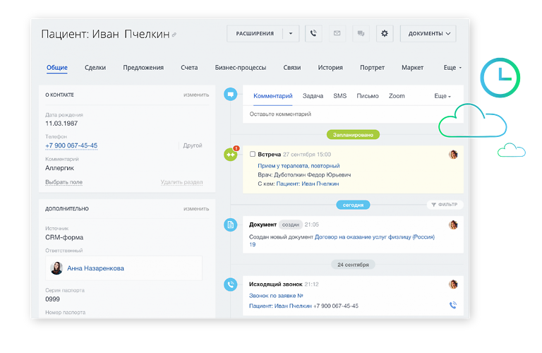 В карточке CRM вы видите все данные о клиенте: контакты, комментарии врачей, прикрепленные документы, предстоящие встречи.